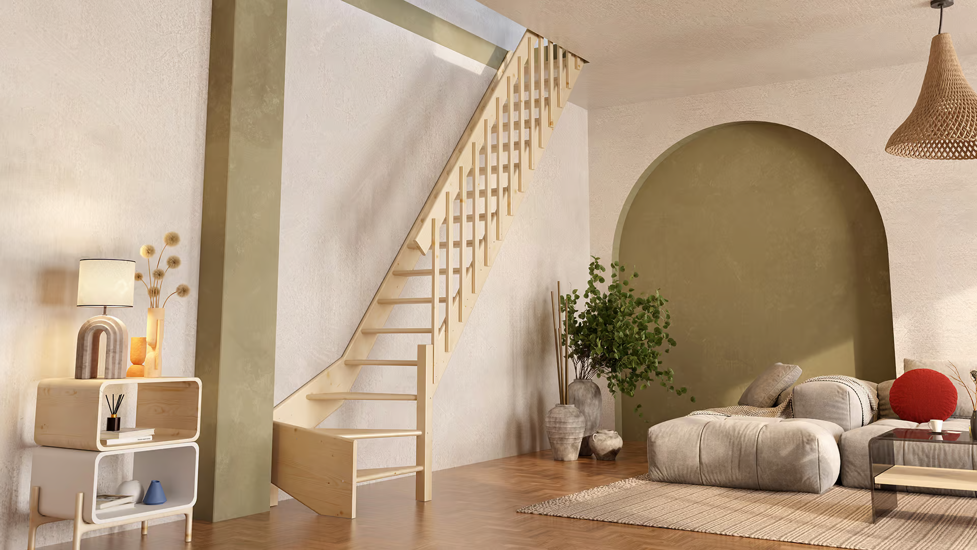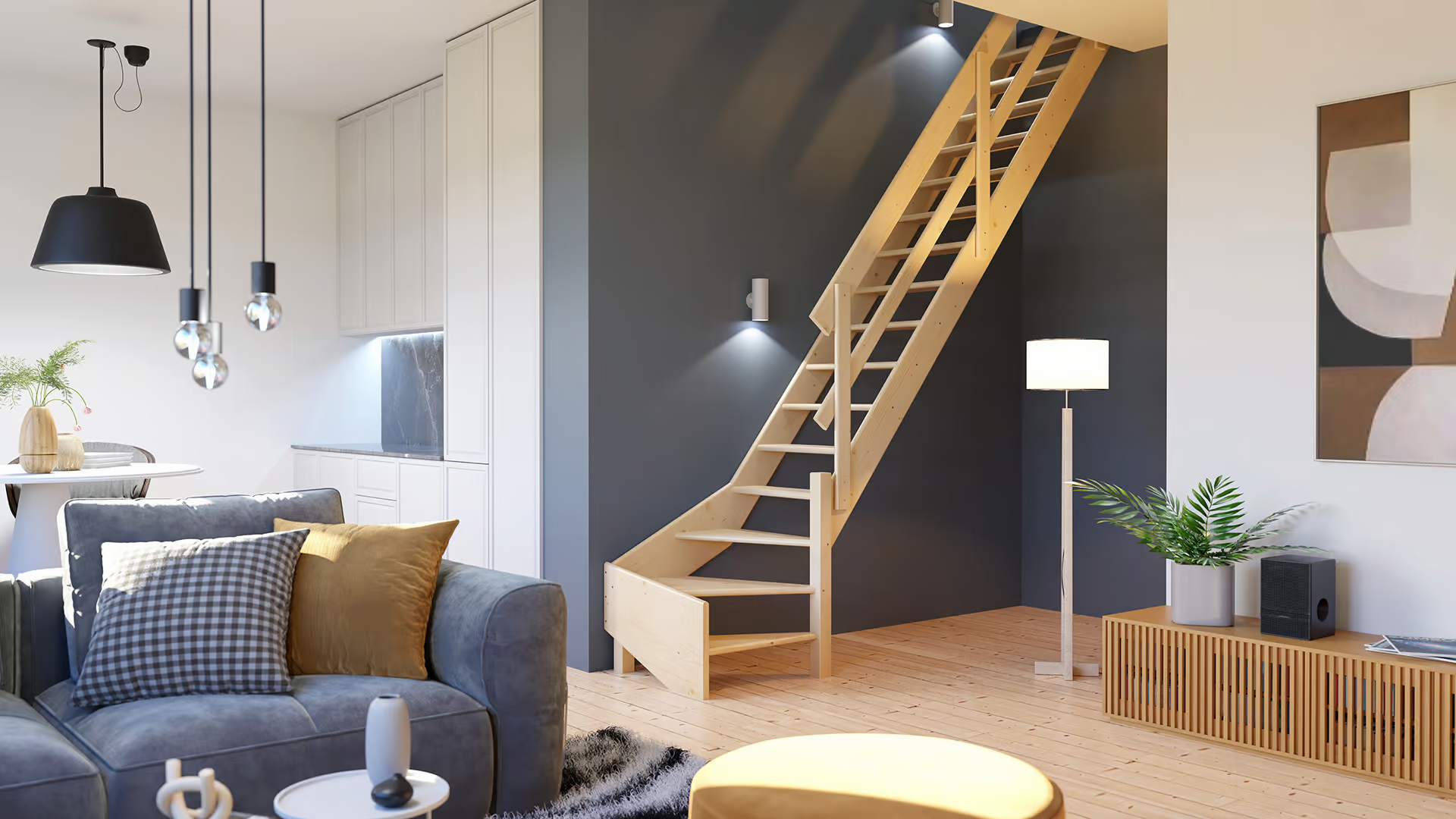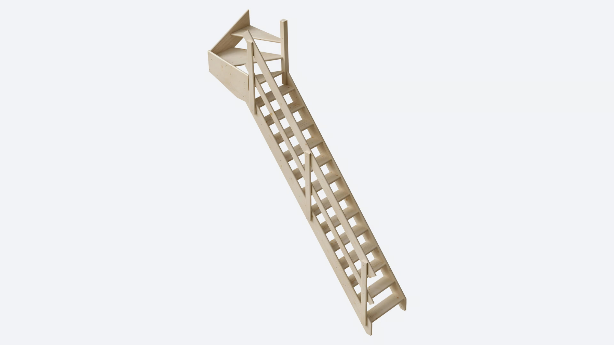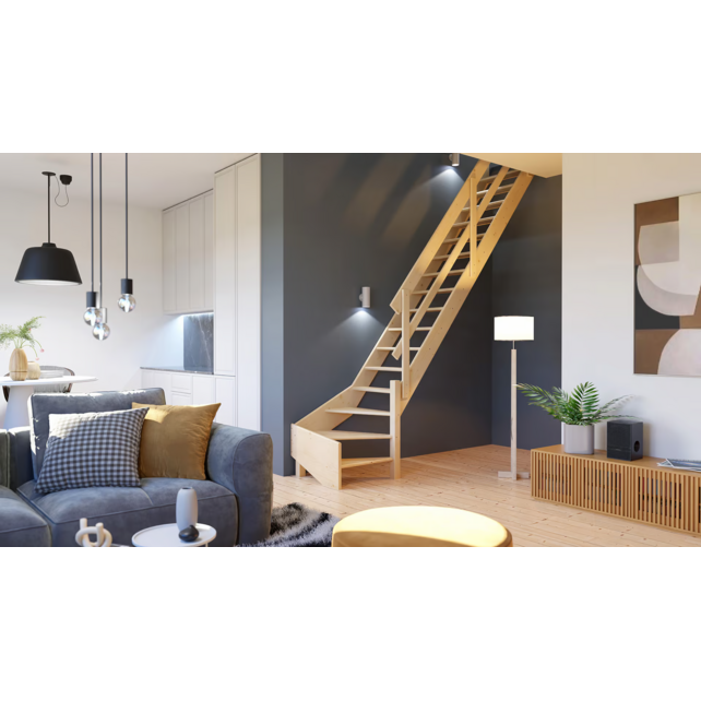 De COTTAGE MEDIUM is minder steil dan een zolderladder - met een helling van 51,34 graden in plaats van meer dan 60 graden - en kan een verdieping-tot-verdieping hoogte van 300 cm bereiken. Hij heeft 14 treden met een diepte van 19 cm en een totale lengte van 230 cm. Dit maakt het mogelijk om hem in de kleinste ruimtes te plaatsen terwijl je toch kunt rekenen op aanzienlijk gebruiksgemak. Voor de configuratie met 3 draaitreden bedraagt de hoogte verdieping-tot-verdieping 340 cm en met een optionele afgeronde trede zelfs tot 365 cm.
