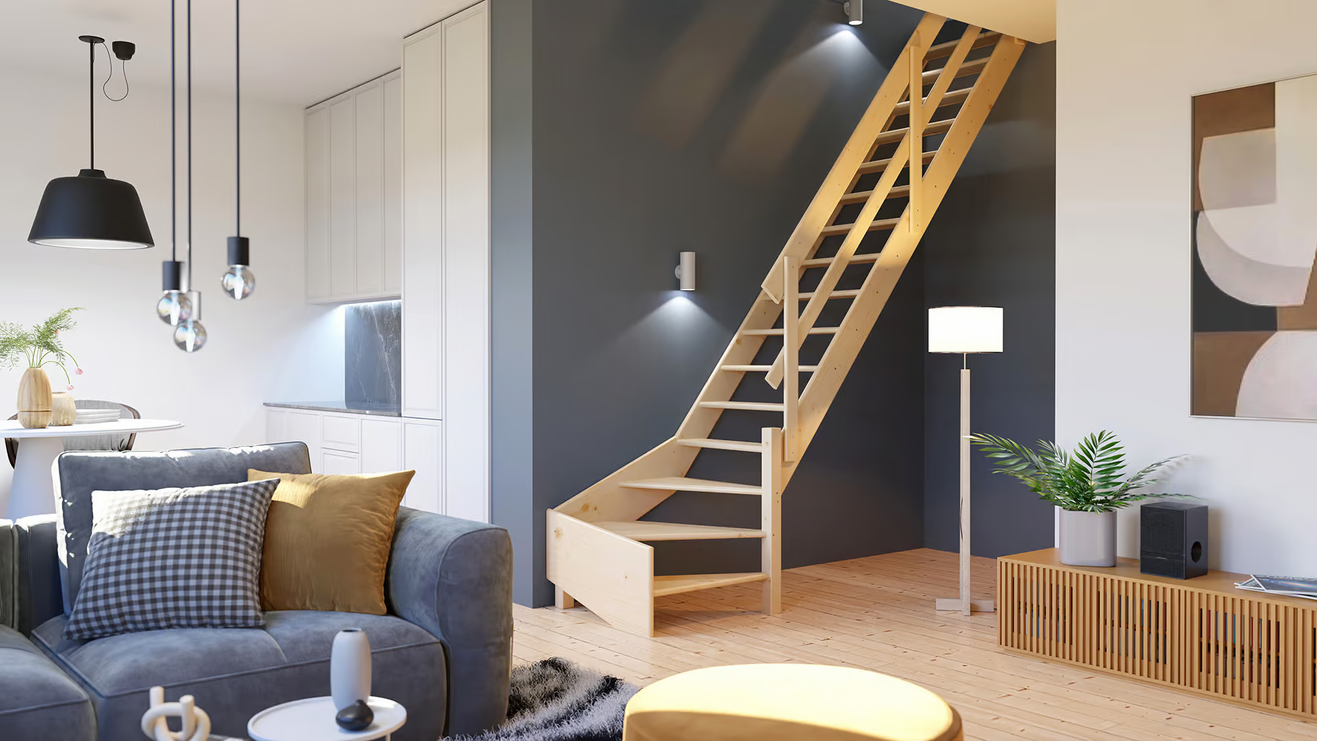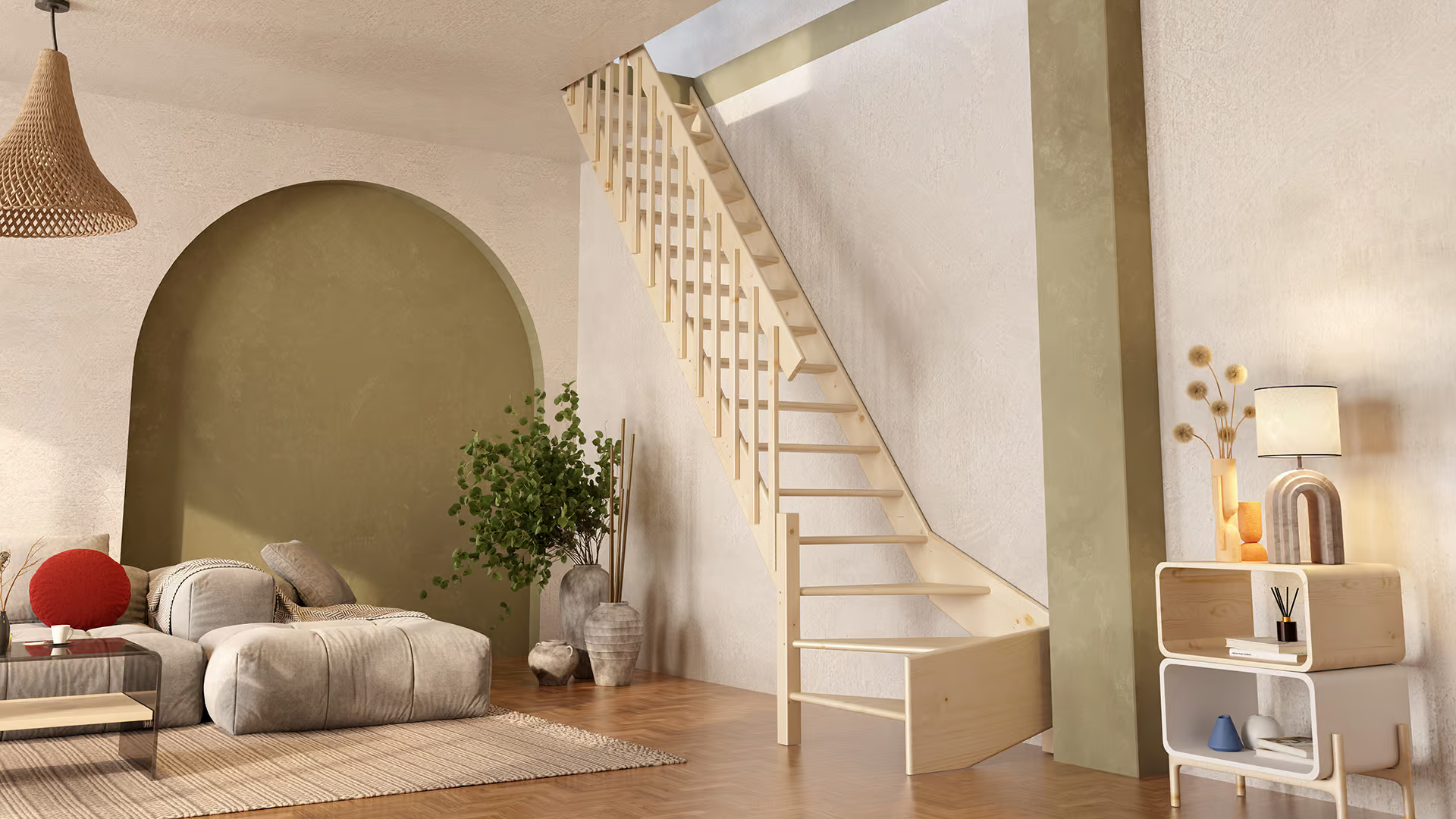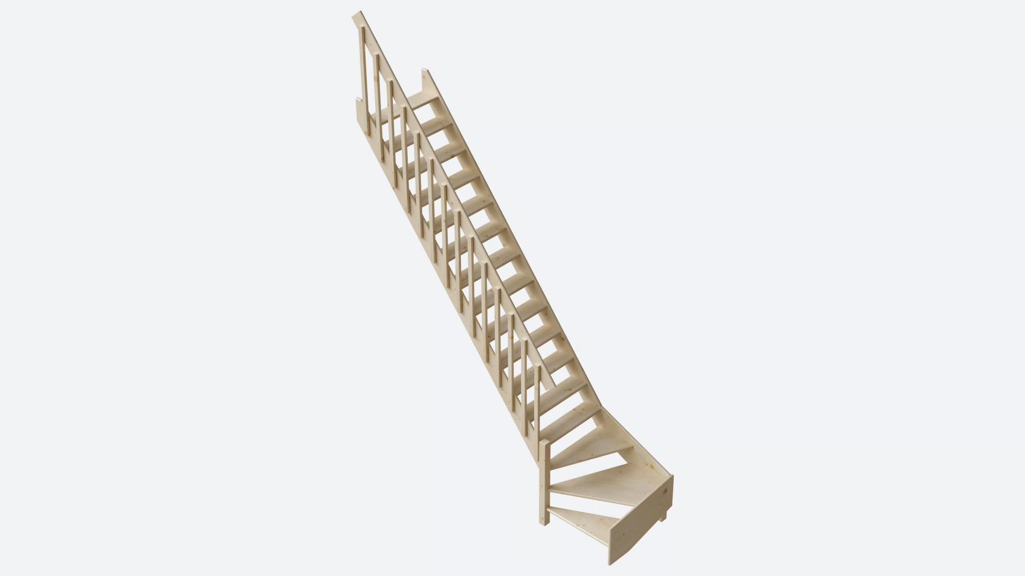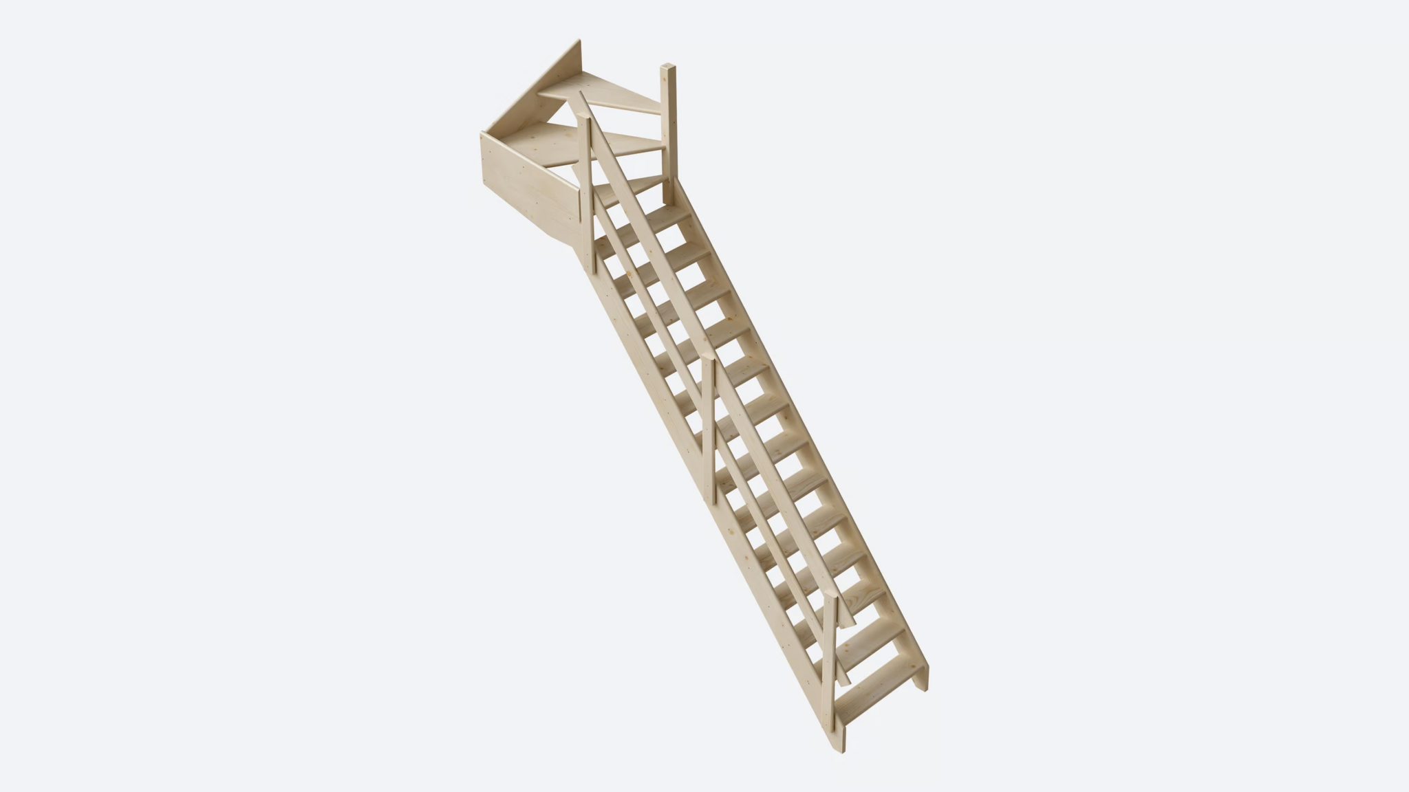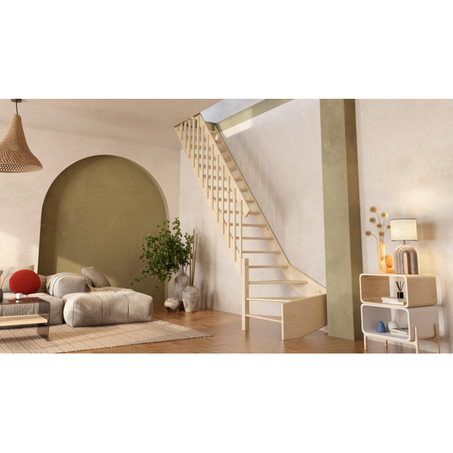 De Cottage Molenaarstrap met kwartslag, die 80 cm breed is, bestaat uit een rechte sectie en een kwartslag sectie. Deze trap is vervaardigd van vurenhout. In bepaalde situaties, of als je de esthetiek ervan waardeert, kan het nodig zijn om een trap met een kwartslag te plaatsen in plaats van een rechte steektrap.