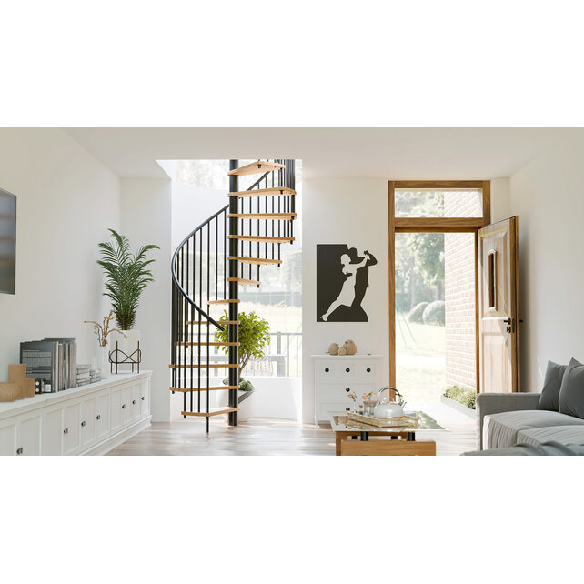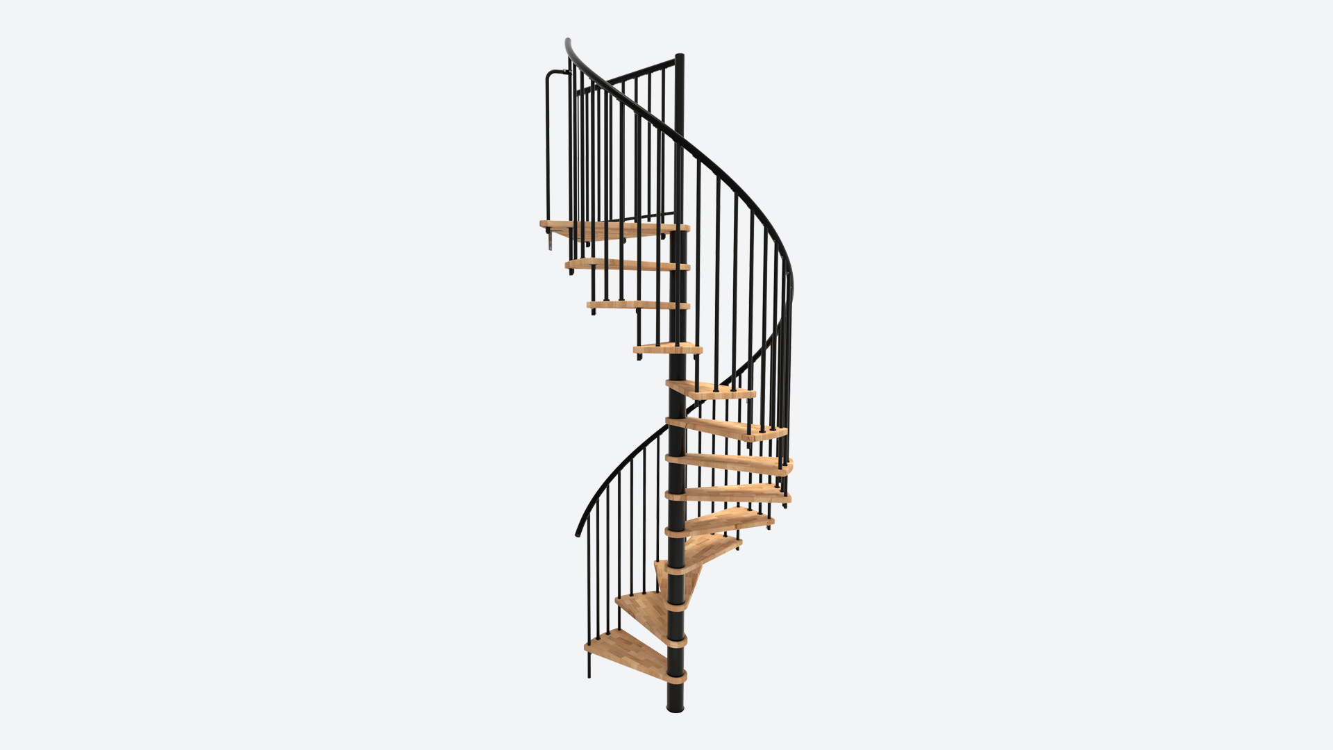 Een prachtige spiraaltrap waarbij twee passende kleuren, zwart en beukenhout, zorgen voor een moderne en exclusieve uitstraling. De spiraaltrap Kappa heeft 12 treden van gelakt beukenhout (35 mm), inclusief een driehoekig landingplatform bovenaan - ook van gelakt beukenhout. De 12 treden plus het platform zorgen voor 13 stijgingen en een maximale hoogte van 309 cm. Elke trede is verstelbaar in hoogte tussen 22-23,8 cm.