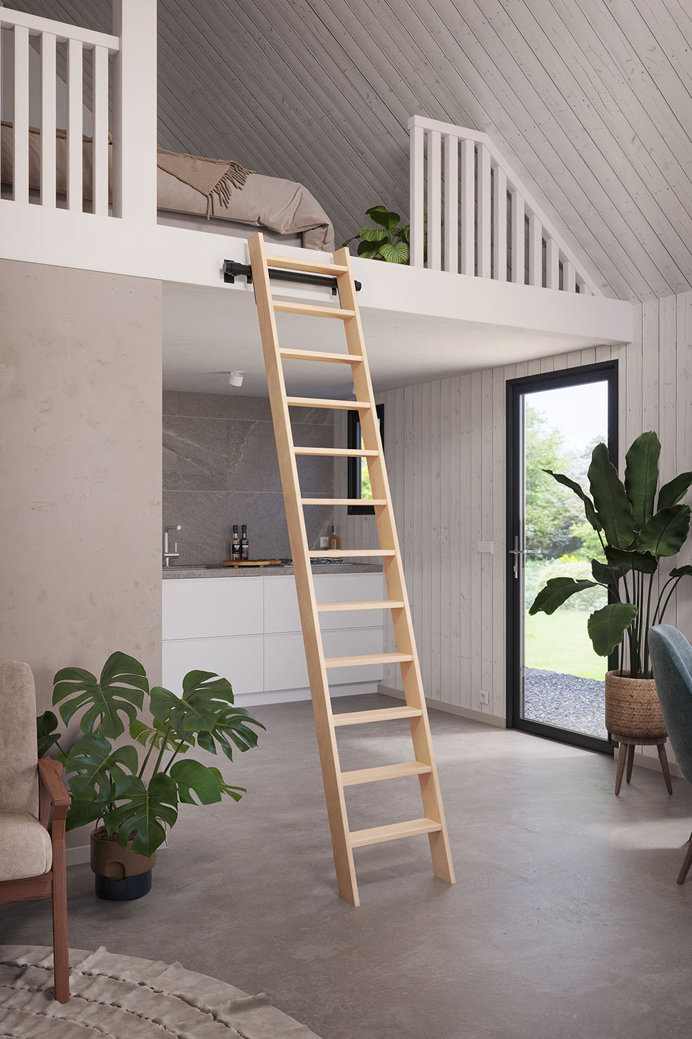 Beukenhouten molenaarstrap. Ambachtelijke geproduceerde molenaarstrap van hoogwaardig, gehard beukenhout. Voor zolders, boekenkasten en stapelbedden/hoogslapers. Zeer robuust, maximale draagvermogen 200 kg.- Klantenbeoordeling 9.4/10