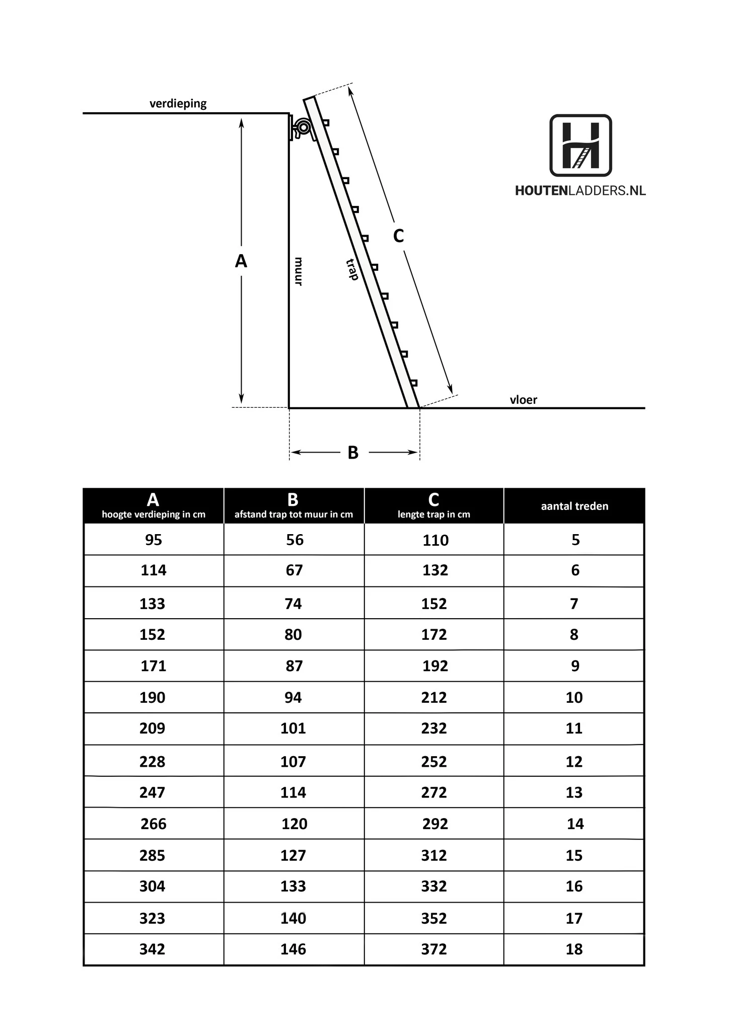 De trap biedt een oplossing voor hoogtes van 104 cm (5 treden) tot 342 cm (18 treden). De tabel hieronder is een overzicht met de beschikbare traplengtes en het geeft aan welke trapmaat (aantal treden) wordt aanbevolen bij de verschillende loodrechte hoogtes. De loodrechte hoogte is de afstand tussen de vloer en de bovenkant van de gewenste plek van bevestiging. De treden van de trap staan in een vaste hoek in de trap. De trap kan dus niet schuiner worden gezet dan aangegeven in de tabel, want bij een afwijkende hellingshoek zijn de treden niet meer horizontaal.