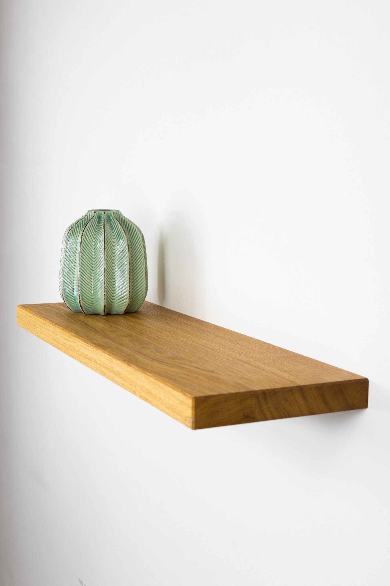 De zwevende wandplank is voorzien van een warme kleur, transparante olie. De wandplank heeft een natuurlijke en matte look. De wandplank eiken is van hoogwaardig eikenhout. De kwaliteit en de autheniciteit van het eikenhout is goed te zien in de structuur en uitstraling van de eikenhouten wandplank.